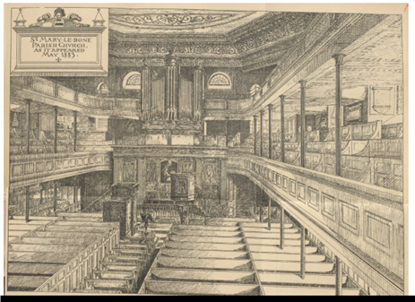 By the end of the 18th century, the farmlands of the parish had been extensively developed. Portland Place, Harley Street and Wimpole Street had become a residential area for wealthy families. The little church was hopelessly inadequate for a hugely increased population. The architect Sir William Chambers (1723-1796) was asked to produce designs for a new grand parish church. His monumental design (1770) for a building shaped like a Greek Cross with a huge dome was rejected in favour of a design by Thomas Hardwick, who had recently completed the building of the St Marylebone Mortury Chapel (now St John's Wood Parish Church).