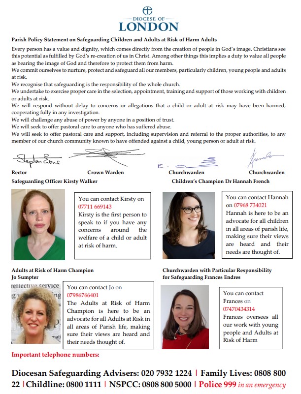 The PCC has adopted the Church of England’s/Diocese of London’s policies and best practice (including that set out in the House of Bishops’ Promoting a Safer Church safeguarding policy statement) on safeguarding linked here.