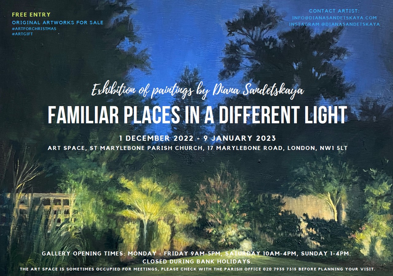 This exhibition brings together a collection of oil paintings by Diana Sandetskaya created over the last few years and inspired by the observation of places in her immediate neighbourhood in North London.