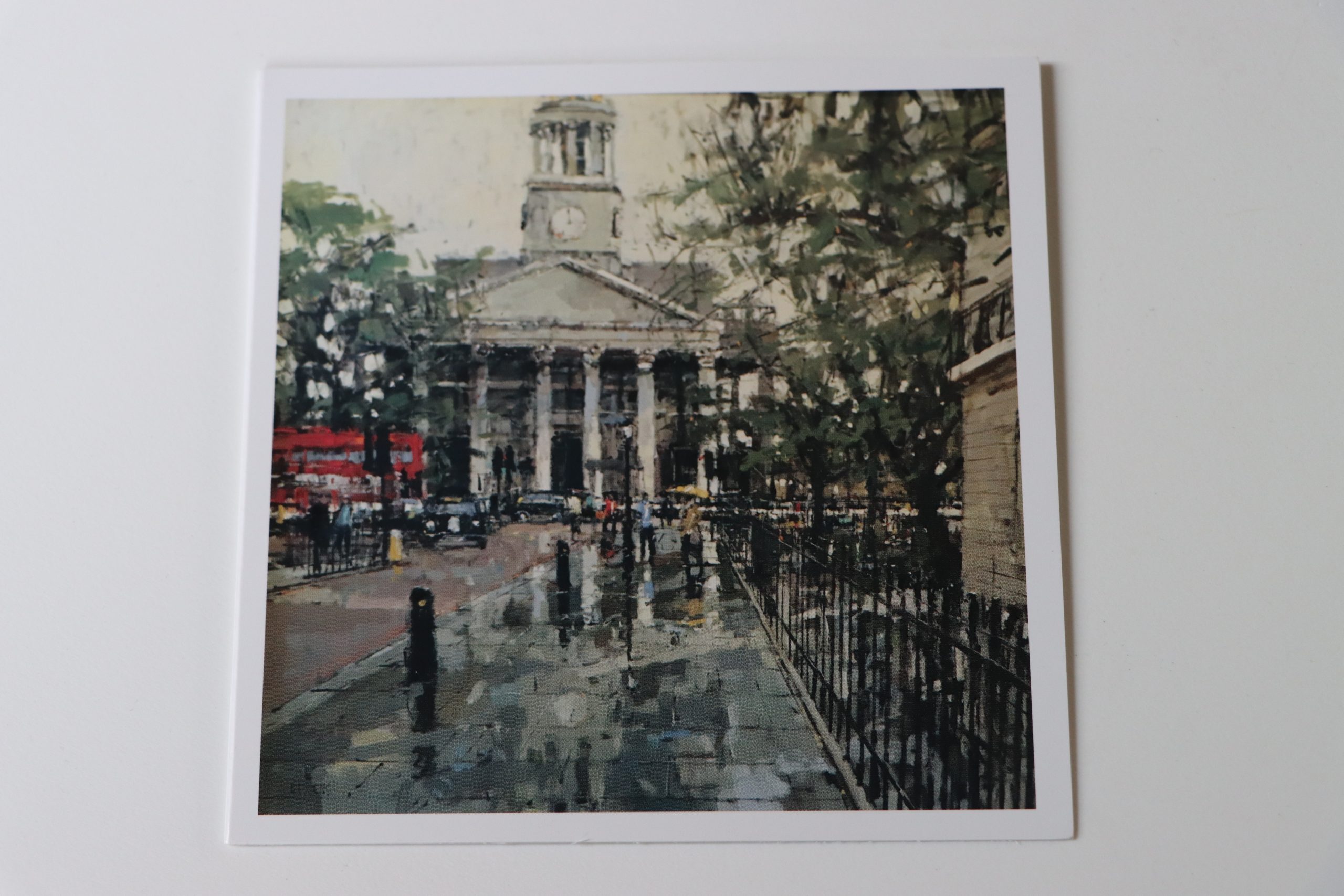 A signed and numbered authorised limited edition print of the parish church from York Gate hanging in the Browning Room by Robert E. Wells. The print measures 495mm square, is printed on silk vinyl and is unframed with white borders.